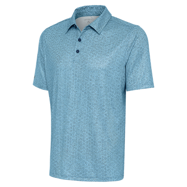 Play in style and comfort with the Antigua Backspin Men's Polo in Skylight/Navy. Made from a high-quality blend of 94% polyester and 6% spandex sheen jersey fabric, this polo shirt offers a lightweight and breathable feel that will keep you comfortable throughout your round. The sublimated geo print adds a modern touch to the classic design, making it a versatile piece that can be worn both on and off the golf course. With its short sleeves, self-collar, collar band, and hem vents, this polo provides optimal ventilation to keep you cool on hot days. Complete with a matte button featuring the Antigua triangle logo on the right sleeve; this polo combines style and functionality for the discerning golfer.