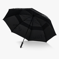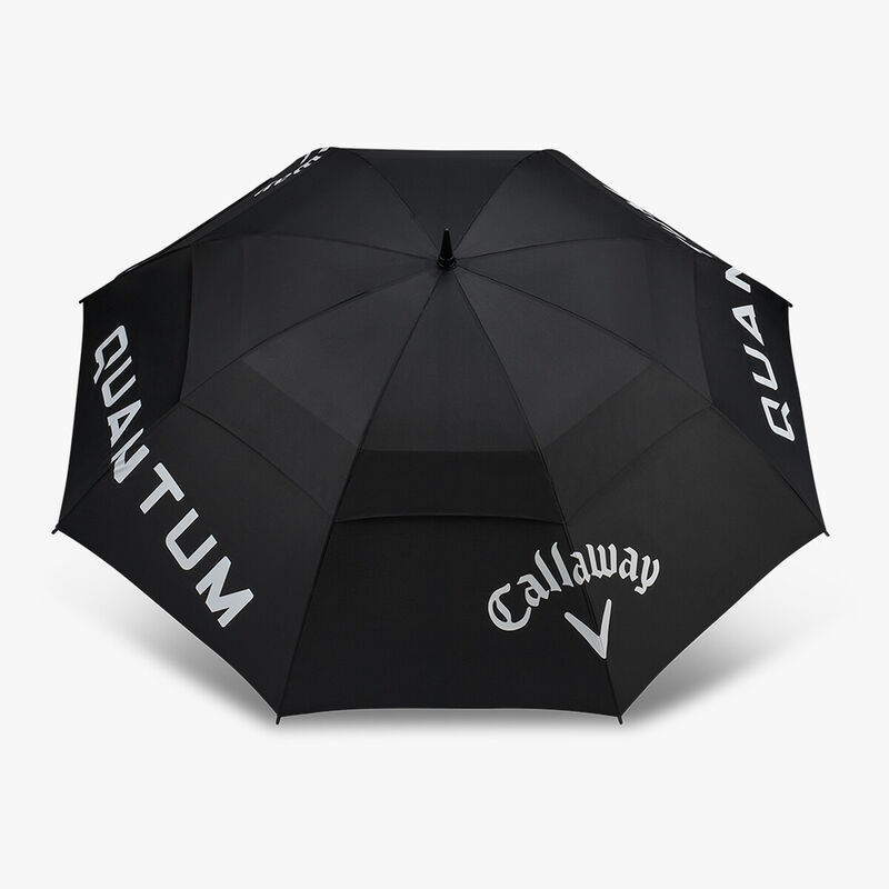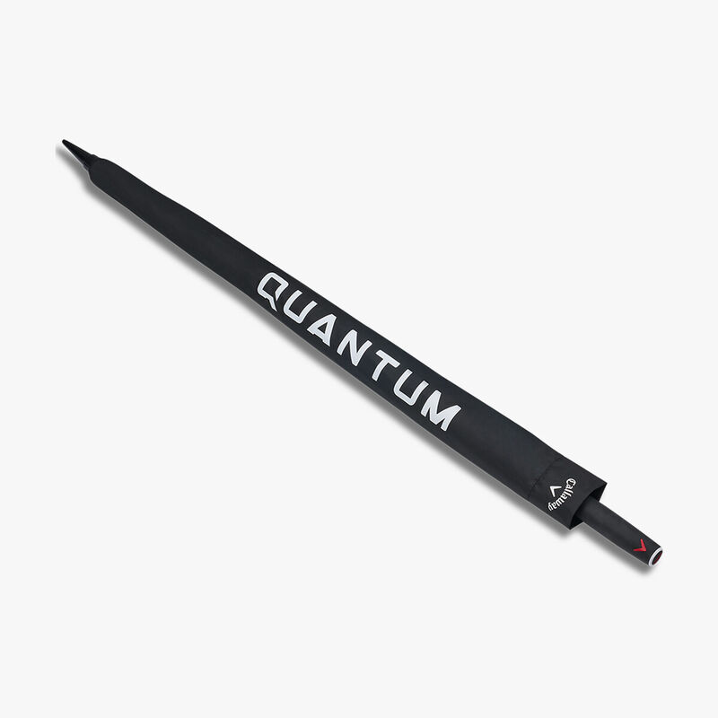 Tour calibre oversized performance umbrella with a lightweight fibreglass shaft, Quantum branding, ventilation holes for wind pass-through, and a non-slip ergonomic handle.