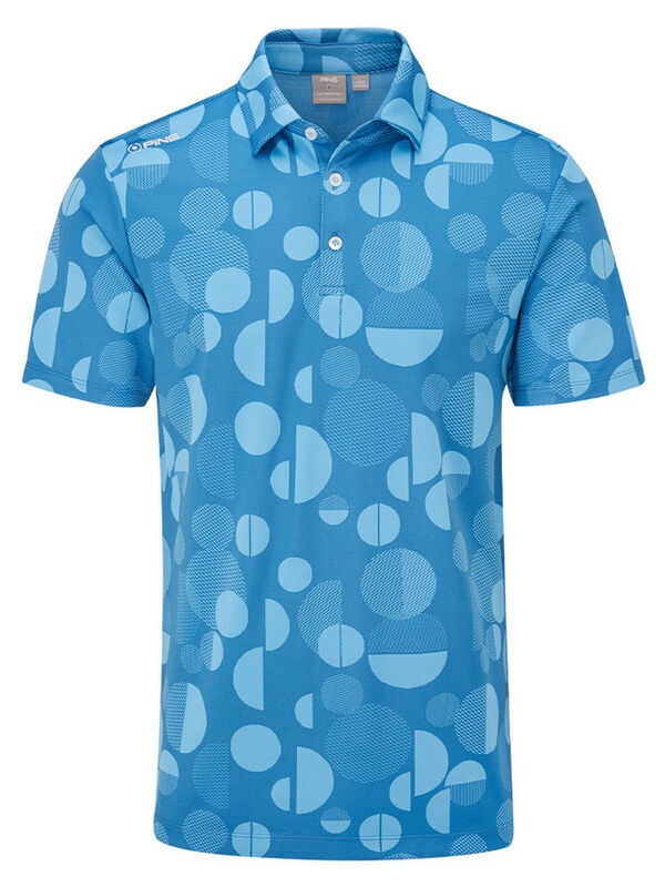 Make a statement on the golf course with the PING Jay Polo. Crafted from 100% polyester, this polo features an all-over jacquard design inspired by the iconic PING split ball. The PING Eye logo on the shoulder and Eye Mark logo on the back shoulder add a touch of authenticity to your look. Enjoy ultimate comfort with its crease-resistant fabric that keeps you looking sharp without any effort. Stay cool and dry with the moisture movement and quick-dry properties, while the stretch properties provide freedom of movement for your swing. With its concealed button-down collar, this polo combines style and functionality for a winning combination on and off the green.