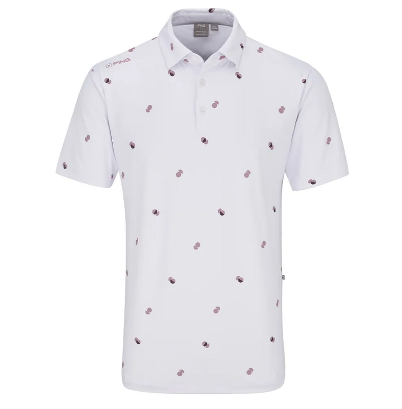 This polo showcases an all-over micro print, paying homage to the iconic PING split ball, making it a must-have for any golfer. With the PING Eye logo on the shoulder and the Eye Mark logo on the back shoulder, you'll stand out in style on the green. Featuring a concealed button-down collar, this polo exudes elegance and versatility. Crafted from a blend of 91% polyester and 9% elastane, it offers exceptional stretch properties for maximum flexibility during your swing. Its antibacterial and moisture-wicking fabric ensures freshness and comfort throughout your game, while its crease-resistant and quick-drying qualities make it easy to care for. Embrace sustainability with this polo's recycled content. Step up your golf apparel game with this high-performance polo shirt.